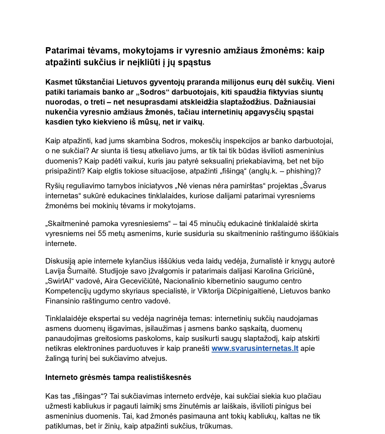 Kviečiame žiūrėti tinklalaides:https://youtube.com/playlist?list=PLhj4IEiY2_-2FveEZi4yGz2GFn7HuAQYZ&si=Jj-i04I6rLbMMVcM